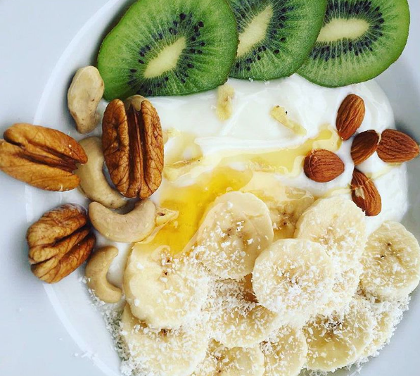 YOGURT CON BANANA-KIWI-FRUTOS SECOS -JENGIBRE- MIEL.